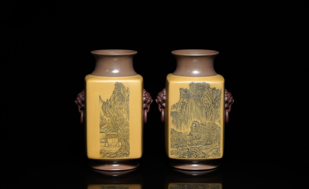 玉琮兽耳瓶 明唐伯虎《品茶图》,北宋 范宽 《溪山行旅图》 八尺一寻刻制 青色起源订制