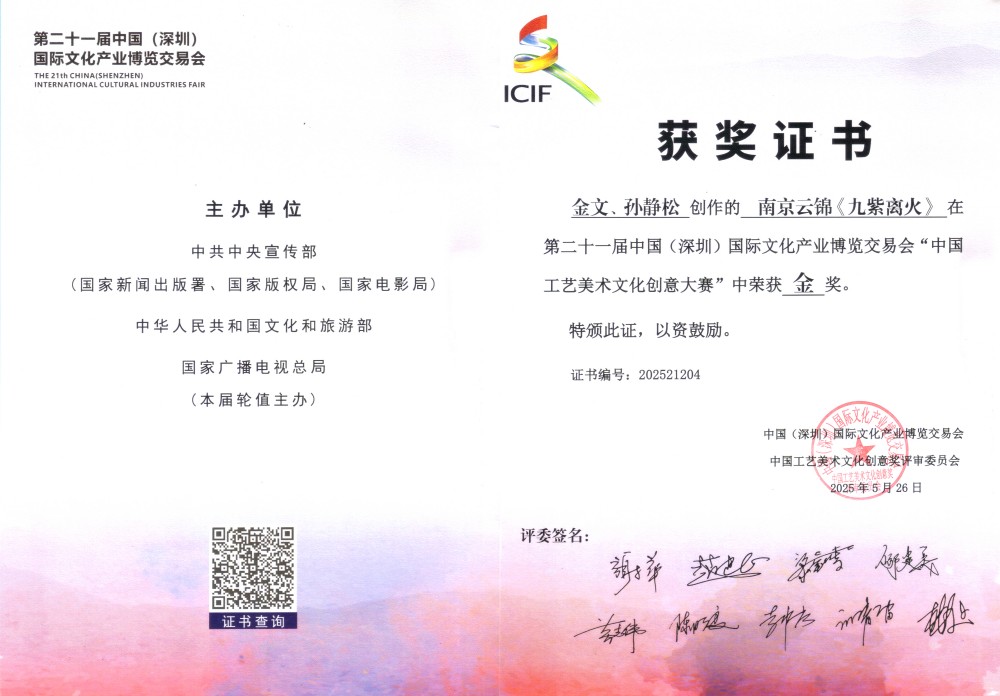 2025年 云锦《九紫离火》荣获第二十一届中国深圳文博会“中国工艺美术文化创意大赛”金奖。同时撰写了《南京云锦》等数十万字的专业论著。获有云锦国家专利及著作权三百余项。作品被多家博物馆收藏。