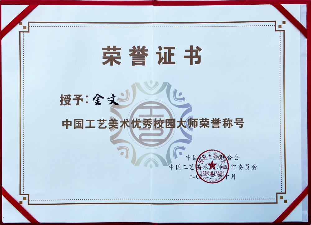 2023年,荣获中国轻工业联合会授予“中国工艺美术优秀校园大师”荣誉称号,云锦《如意之旋》荣获2023中国(杭州)工艺美术“神工杯”创意设计金奖。