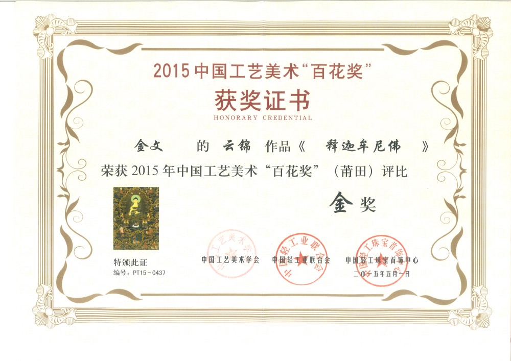 2015年《释迦牟尼佛》荣获中国工艺美术“百花奖”金奖。同年8月,云锦《万里长城》被天安门城楼收藏,并为中国抗战胜利70周年欢迎晚宴设计制作云锦请柬。