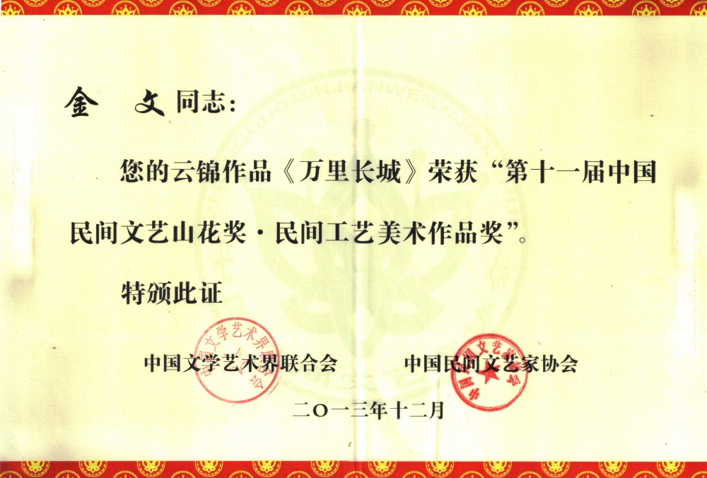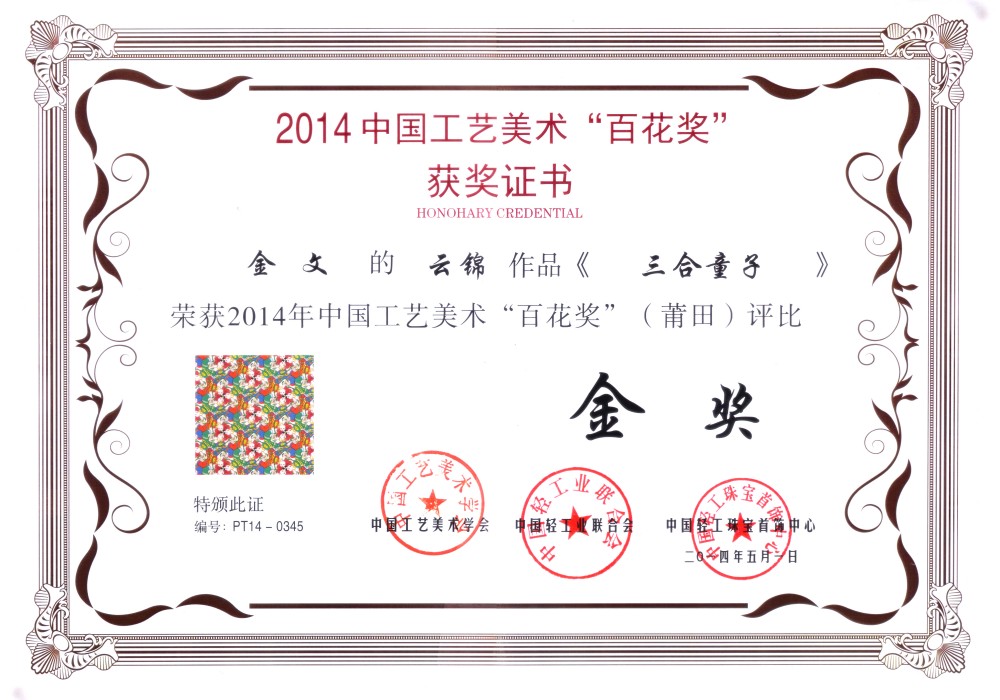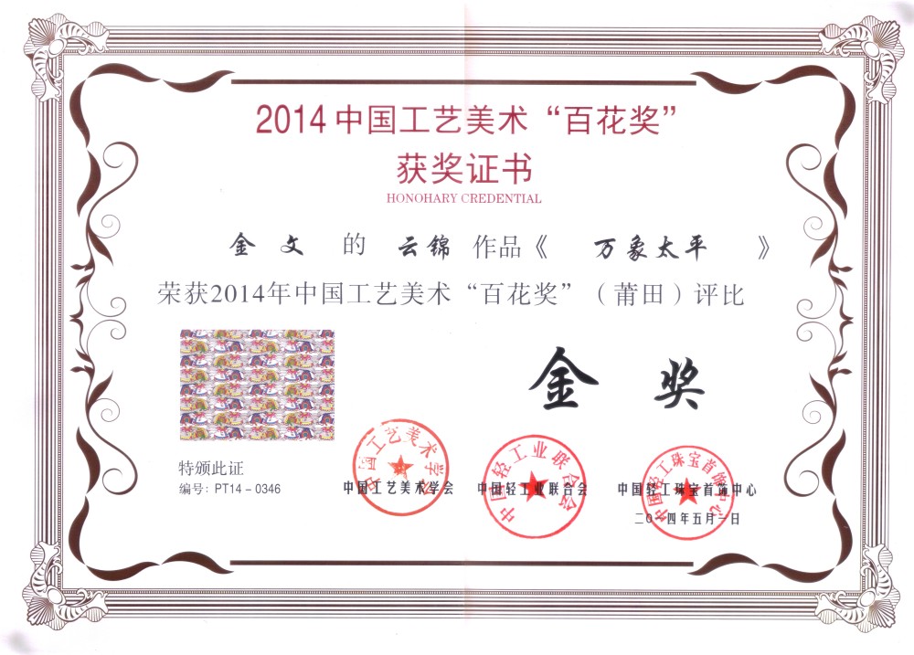 2017年《春夏秋冬》四季图荣获第十届中国(潍坊)文化艺术展示交易会作品最佳创意奖,《荷塘月色》获最佳创新奖。同年,金文获“国匠.荣耀”中国传统工艺振兴者称号,云锦《汤莎会》荣获江苏省工艺美术“艺博杯”金奖,南京市非遗文创设计大赛银奖。