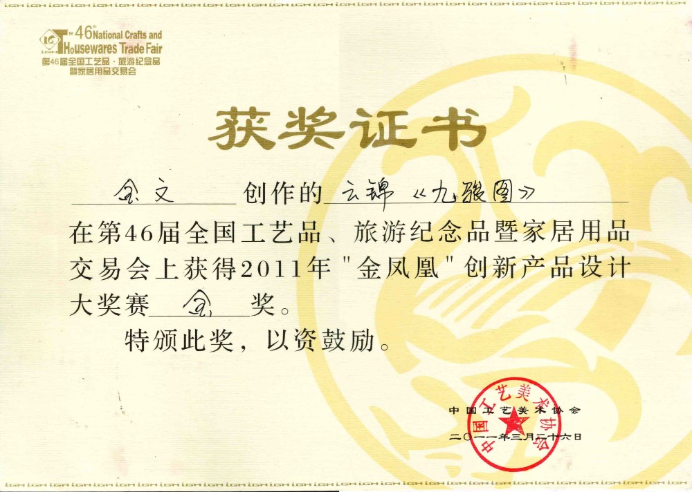 2011年《九骏图》获得“金凤凰”原创设计大奖赛金奖。