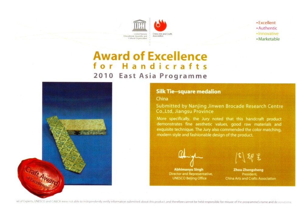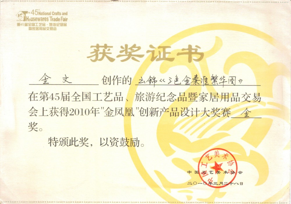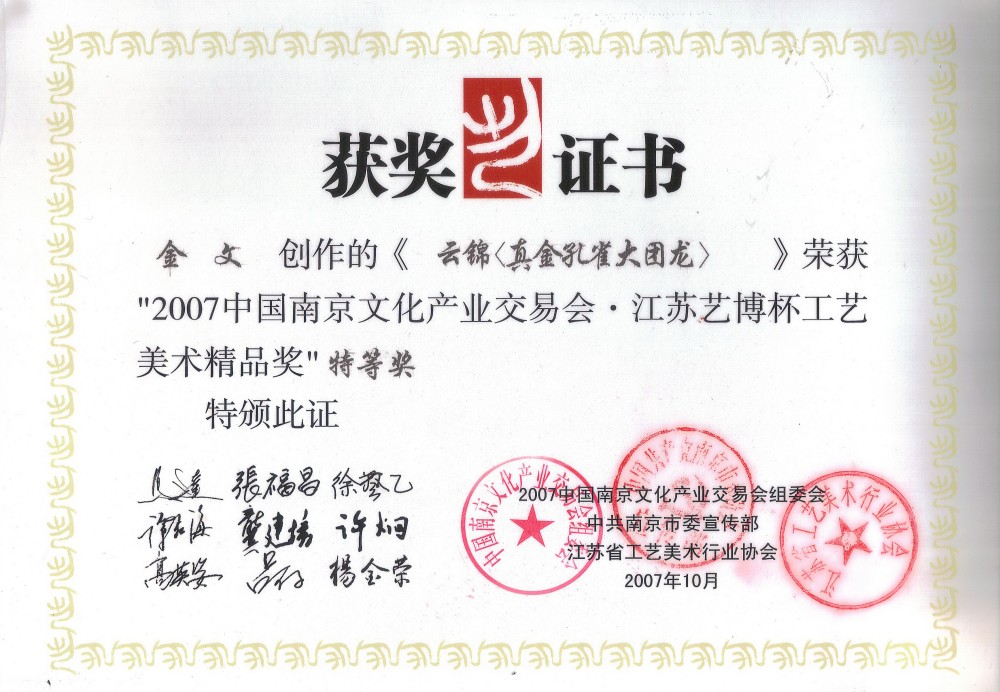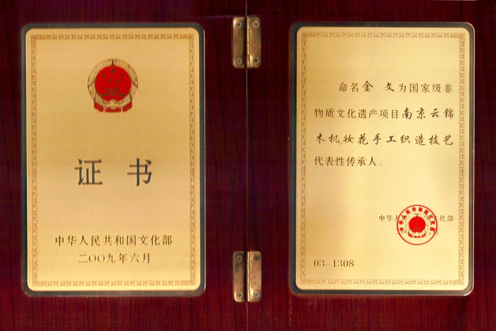 2009年《真金妆花五福龙》荣获中国工艺美术百花奖金奖,2010年《三色金秦淮繁华图》获“金凤凰”原创设计大奖赛金奖。《雄蚕丝领带》荣获联合国科教文杰出手工艺徽章。