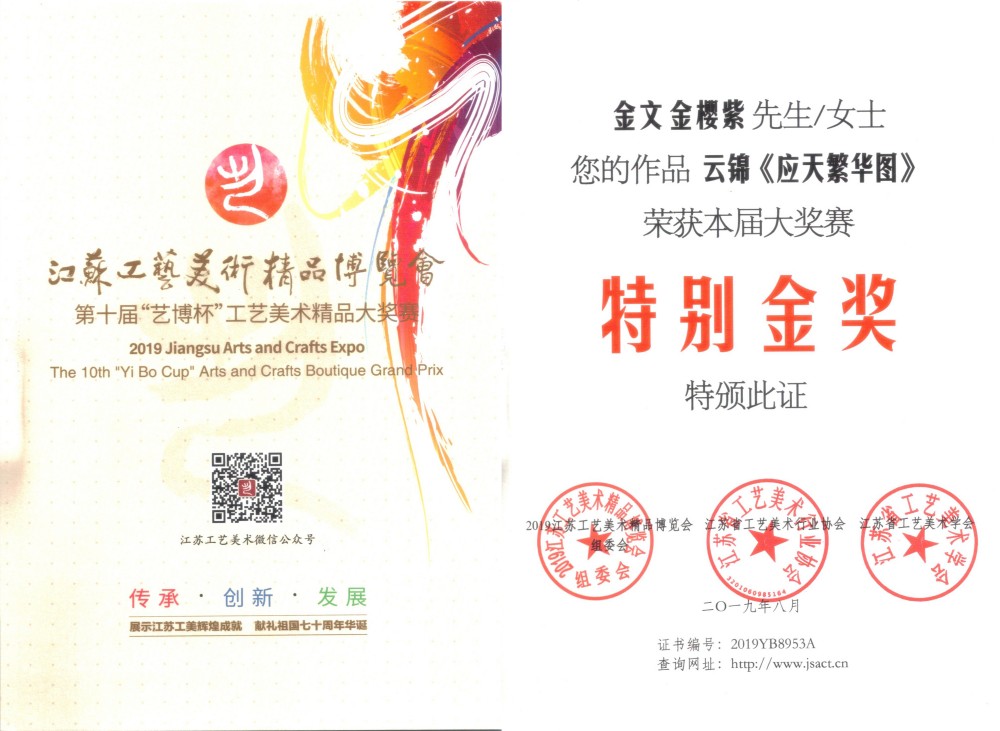 2019年《应天繁华图》获江苏省工艺美术“艺博杯”特别金奖,并获得国家艺术基金项目。