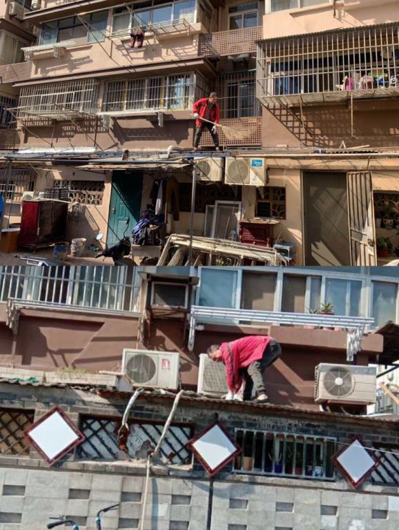 第一支队伍负责清理迎街一楼屋顶及河道旁漂浮物,减少入夏蚊虫困扰并提升美观。