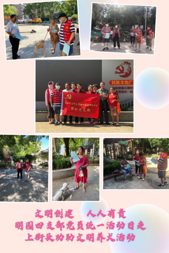 明园社区第四党支部结合文明城市创建工作开展“文明养犬”主题党日活动。第四党支部书记带领党员志愿者们在凉亭、社区广场等人群聚集的地方,发放《致广大养犬居民的一封信》、宣传文明养犬规范和注意事项,告知养犬户要定期驱虫、按时接种疫苗、办理证明、在为居民答疑解惑的同时鼓励大家都做文明养犬人。