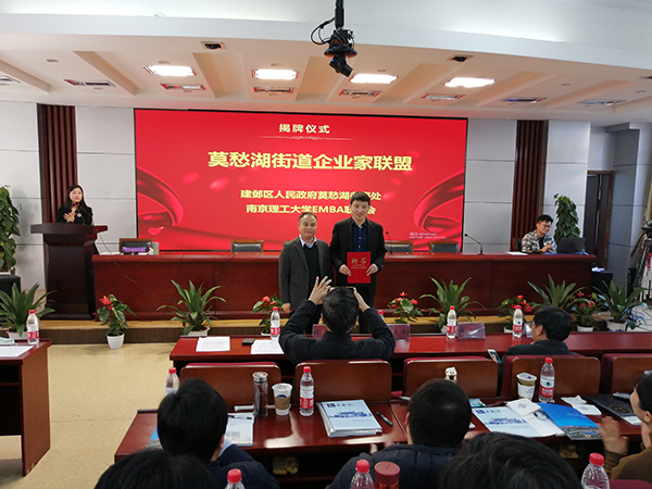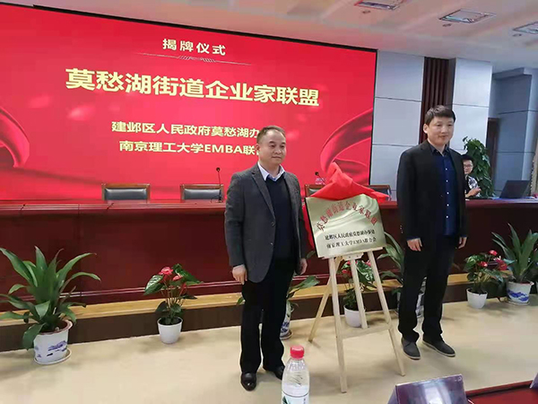 莫愁湖街道主要负责人、南京理工大学EMBA联合会主席共同为“莫愁湖街道企业家联盟”揭牌。莫愁湖街道主要负责人为南京理工大学EMBA联合会主席颁发“莫愁湖街道产业研究顾问”聘书,希望未来可以形成更多合作关系,推动产业项目在莫愁湖板块落地。