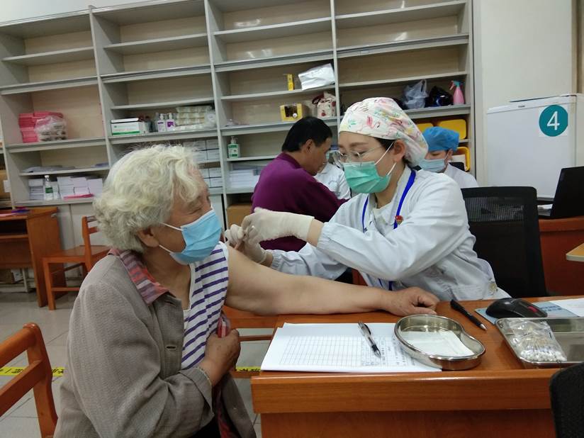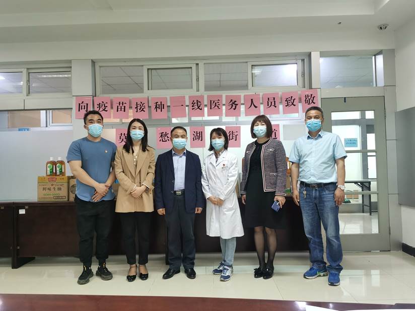 5月2日,莫愁湖街道主要负责人带队前往南湖医院、滨湖医院慰问疫苗接种的一线医务人员。莫愁湖街道地处南京市建邺区北部,属于老旧小区的集中区域,老龄人口较多。街道因地制宜,把疫苗接种搬到居民“家门口”,让疫苗“多跑路”、居民“少跑腿”。居民们纷纷表示,“家门口就能疫苗接种,不用预约不用排队,真的太方便啦!”有的居民在散步时听闻疫苗接种不用排队,立刻前来接种。