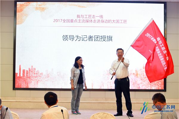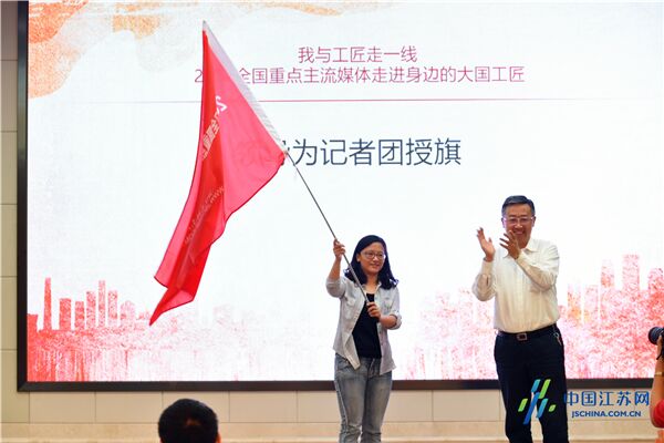 江苏省总工会副主席马永青为记者采风团代表蒋菡授旗