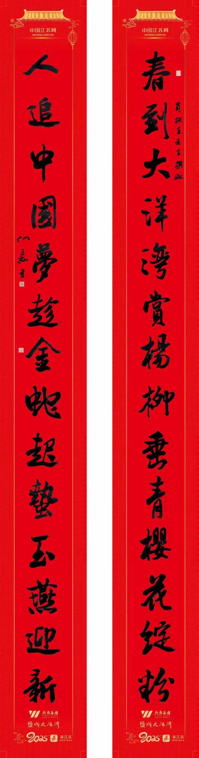 下联着重描绘春节时欢欣鼓舞的热闹氛围。以“人追中国梦”起句,紧密贴合时事,读来气势磅礴,同时也充分展现出盐城人民拼搏进取的精神风貌。为避免单纯描写人的活动而导致表现面狭窄,作者巧妙引入乙巳年的生肖蛇元素,并另辟蹊径,避开常用的“金蛇起舞”等表述,选用 “起蛰”一词,不仅更为精准形象,且表现力十足。五代诗人徐铉曾在诗中写道“缕䌽成飞燕,迎和启蛰时”,明末诗人陈恭尹亦有“乘时燕雁知来去,启蛰龙蛇自屈伸”的佳句。人的追梦奋进、蛇的灵动起蛰、燕的轻盈翻飞,共同构成了一幅充满生机活力的迎春图景,象征着盐城在新的一年里青春焕发、高位起势。