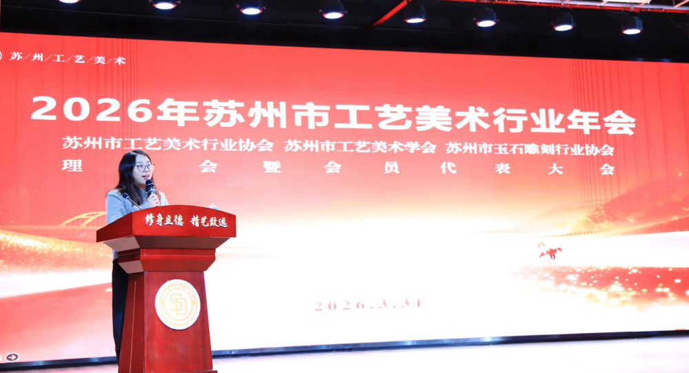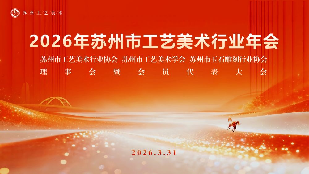 2026年3月31日,苏州市电子信息技师学院大会堂,相关政府部门领导、行业协会负责人、院校代表及工艺美术大师、会员单位代表等共一百五十余人齐聚一堂,苏州市工艺美术行业年会及苏州市工艺美术行业协会、苏州市工艺美术学会、苏州市玉石雕刻行业协会理事会暨会员代表大会在这里隆重举行。