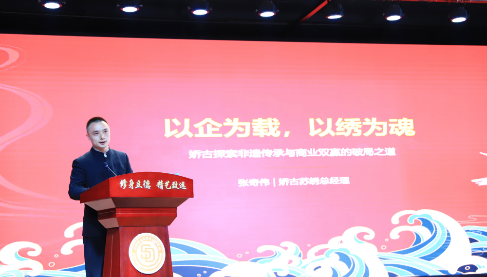 娇古苏绣总经理张奇伟在会上分享了企业的发展经验。他介绍,娇古苏绣依托苏州传统文化资源,从初创逐步发展,如今拥有300多位绣娘,其中达到工艺师水平的有40多位,年产值达5000万元,已成为集设计、生产、销售于一体的品牌服装企业。他在发言中重点讲述了企业在创新中拓展路径、推动作品转化为商品、商品形成品牌,实现非遗传承与商业价值共赢的实践体会。