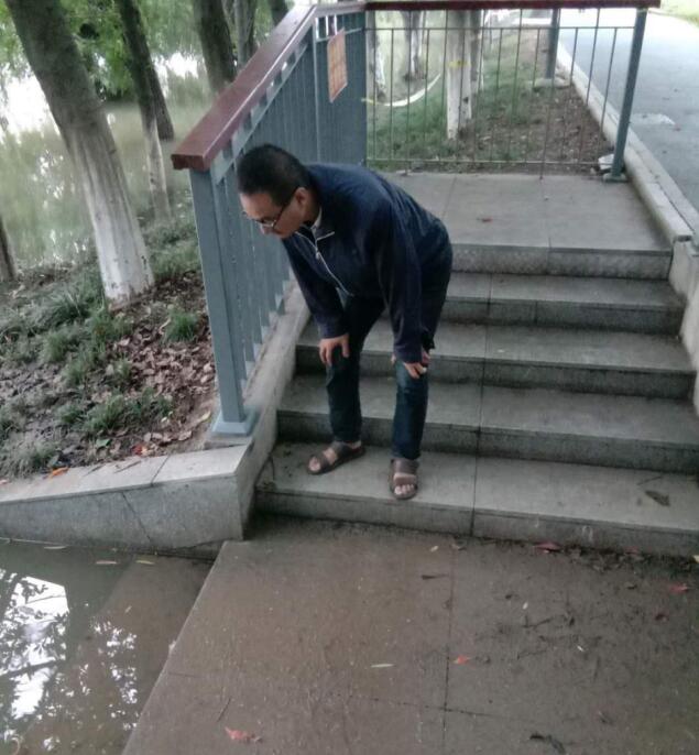 入汛的第一天开始,魏青树、尚伟两人根据街道防汛办安排,对辖区内5河2湖开展常态化巡查,根据天气变化和气象预报,重点关注外秦淮河水位上涨情况及几个易积淹水地段情况,每天凌晨、早、中、晚至少四次在群里播报水位变化情况。尽管手中没有专业测量工具测量水位具体深度,但魏青树自有办法,他以河边步道的台阶为参照物,将水位线标记在台阶处,以此作为水位上涨、回落的依据。他都想好了,如果水位将台阶全部没过,他就选择河边的树木、警示牌作为新的参照物。魏青树的准确播报为街道防汛工作下一步决策部署提供了重要参考。