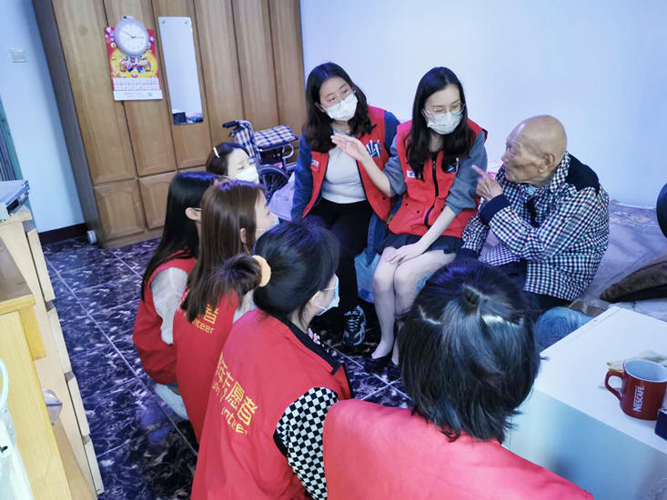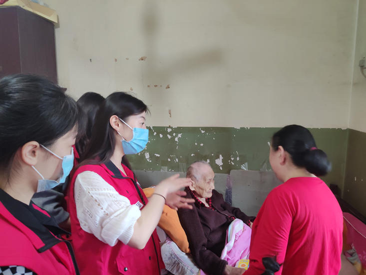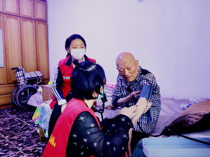 走访101岁老人朱凤英时,老人已经处于卧床状态,但精神依旧很好,青年志愿者们和她的家人进行了沟通,了解老人的情况。她的女儿告诉志愿者们,老人虽然卧床,需要人照顾,但最近状况稳定,精神也不错。志愿者们也为老人测量了血压,并送上慰问品,