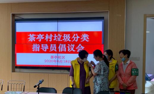 莫愁湖街道茶亭社区作为垃圾分类先行先试单位,致力于推进垃圾分类工作。2020年6月18日下午,茶亭社区联合南京艾比利特环境科技有限公司组织茶亭村“乐益茶亭”志愿者和楼栋长,在茶亭社区开展了一场关于垃圾分类的指导员倡议会。会上,茶亭社区事务服务中心主任蔡瑛瑛向广大居民发出垃圾分类指导员招募倡议,呼吁居民加入到垃圾分类志愿者的队伍中来,指导小区居民进行垃圾分类,做垃圾分类的积极份子,现场居民踊跃报名,社区工作人员为参与垃圾分类指导的居民佩戴了指导员袖章。